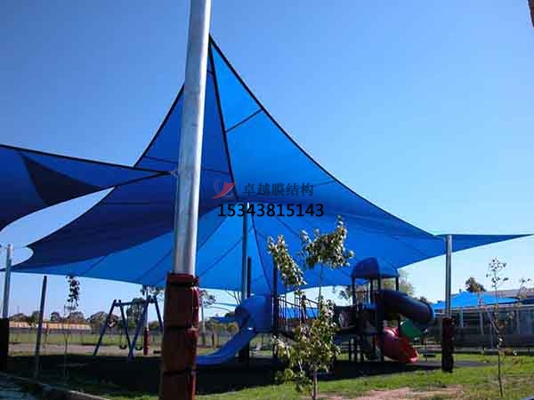 張拉膜景觀遮陽棚的特點:張拉膜景觀遮陽棚具有輕質(zhì)高強、造型多樣、透光性好、耐候性強、施工快捷、環(huán)保節(jié)能、功能復合、維護簡便等多種特點。其采用高強度纖維織物,如聚酯纖維或玻璃纖維,表面涂覆PVC或PTFE等涂層,重量輕但承載能力出色,適合大跨度結構,能減少基礎結構的負擔。膜材具有高度的可塑性,通過鋼索或骨架張拉,可形成流線型、曲面等豐富的造型,如曲線、動態(tài)形狀等,能夠與自然景觀或周圍環(huán)境相融合,創(chuàng)造出獨特的視覺效果,成為景觀中的亮點。部分膜材透光率可達10%-40%,白天可充分利用自然光,減少人工照明能耗,同時營造明亮舒適的空間氛圍;夜晚燈光透射可形成獨特的光影效果,增強景觀的藝術感染力。膜材表面經(jīng)過特殊涂層處理,具備抗紫外線、耐腐蝕、防水、自潔等性能,能夠適應各種惡劣的戶外氣候條件,延長使用壽命,減少維護成本。其構件多在工廠預制,現(xiàn)場安裝簡便,施工周期短,對場地的影響小,能夠快速搭建完成,盡快投入使用,尤其適合一些緊急或臨時性的項目。多數(shù)膜材料可回收利用,符合可持續(xù)發(fā)展理念;其透光性和保溫性能有助于降低能耗,減少對環(huán)境的影響。張拉膜景觀遮陽棚兼具遮陽、擋雨、防風、空間劃分、藝術裝飾等多重功能,還可以與其他設施如噴霧降溫設備、照明設備等相結合,提供更豐富的使用體驗。其表面光滑不易積塵,日常僅需簡單清潔,定期檢查節(jié)點和膜面狀況即可保障結構的安全和正常使用,維護成本較低。