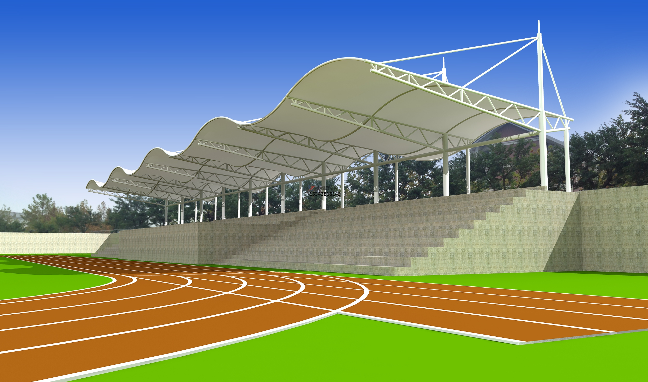 2、赤峰市智奧實業(yè)有限公司體育場看臺頂棚/運動場主席臺/風雨操場雨棚生產(chǎn)廠家