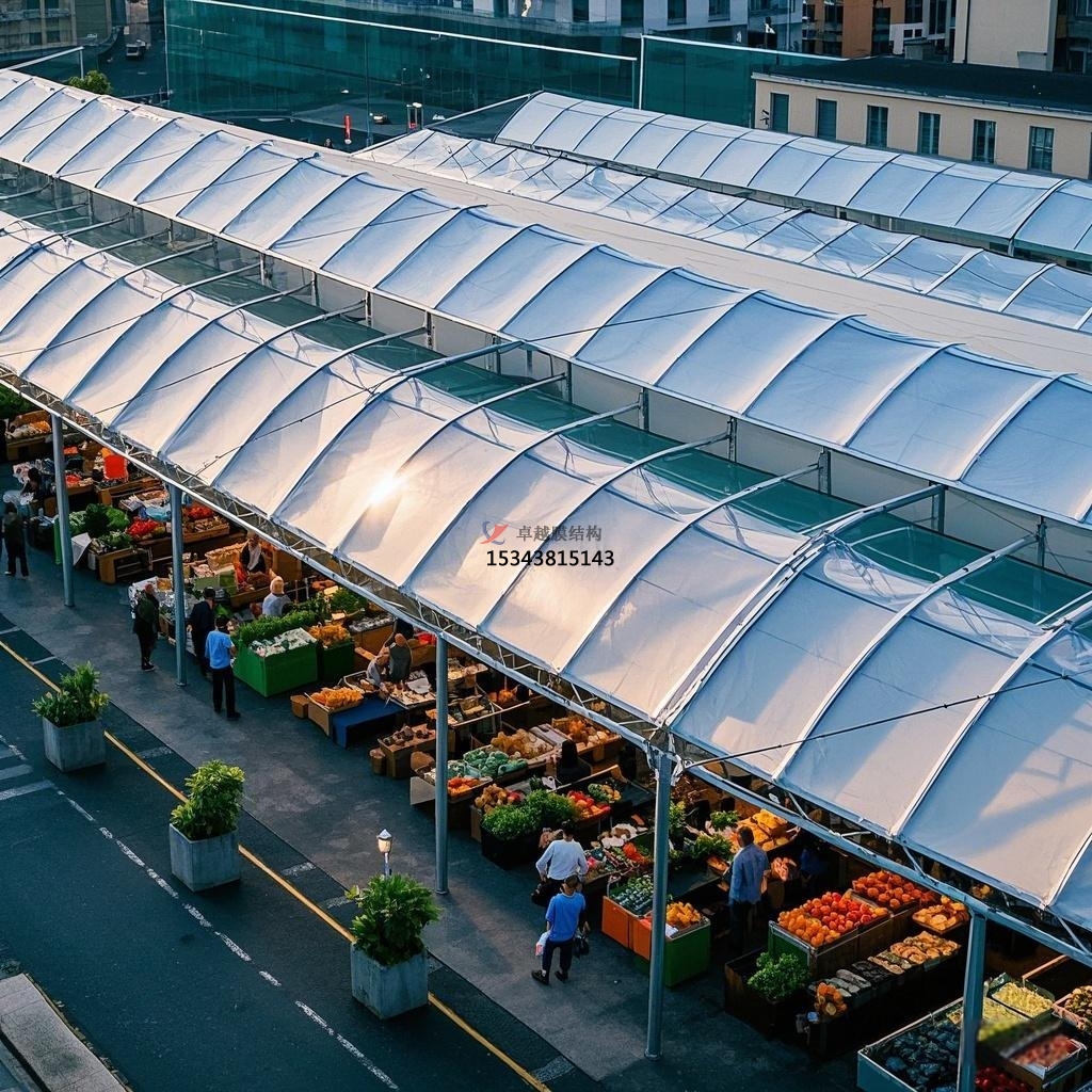 傳統(tǒng)農(nóng)貿(mào)市場常常因建筑結(jié)構(gòu)的限制,存在空間布局不合理、攤位設(shè)置擁擠等問題。而膜結(jié)構(gòu)的無柱大空間特性,為農(nóng)貿(mào)市場的空間規(guī)劃提供了更大的靈活性。內(nèi)部可以根據(jù)商品種類、人流量等因素進(jìn)行自由劃分,設(shè)置寬敞的通道和開闊的交易區(qū)域,避免了顧客在購物過程中的擁擠和堵塞,提升了購物的便捷性與舒適度。此外,膜結(jié)構(gòu)還可以與其他建筑元素相結(jié)合,如在市場周邊設(shè)置膜結(jié)構(gòu)的雨棚或連廊,為顧客提供遮風(fēng)擋雨的過渡空間,進(jìn)一步優(yōu)化了市場的整體空間利用效率。?