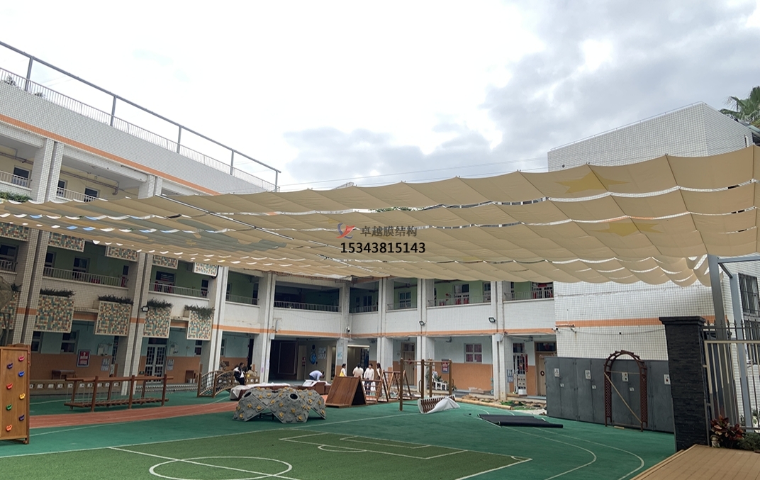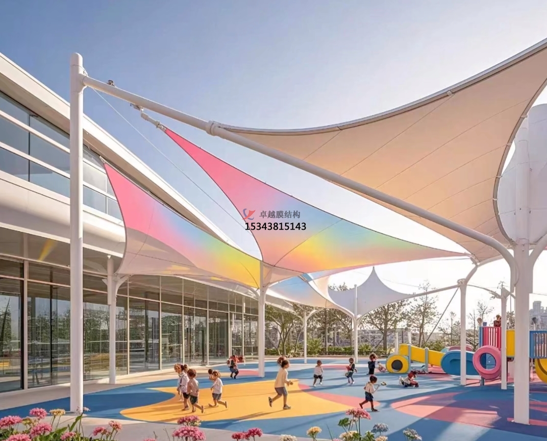 膜材料具有良好的透光性,可以在保證遮陽的同時,讓自然光線柔和地灑入室內(nèi),為孩子們提供充足的日照,有利于他們的視力保護和身心健康。同時,膜結(jié)構(gòu)的設(shè)計通常結(jié)合高效的通風(fēng)系統(tǒng),確保室內(nèi)空氣流通,即使在炎熱的夏季也能保持室內(nèi)涼爽,為孩子們創(chuàng)造一個舒適的學(xué)習(xí)環(huán)境。