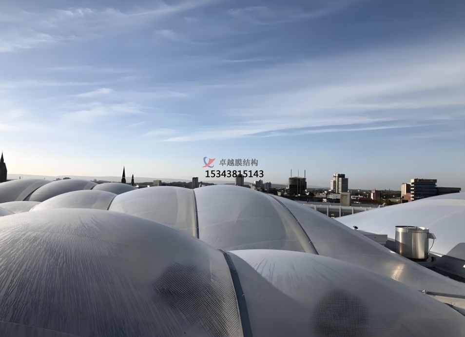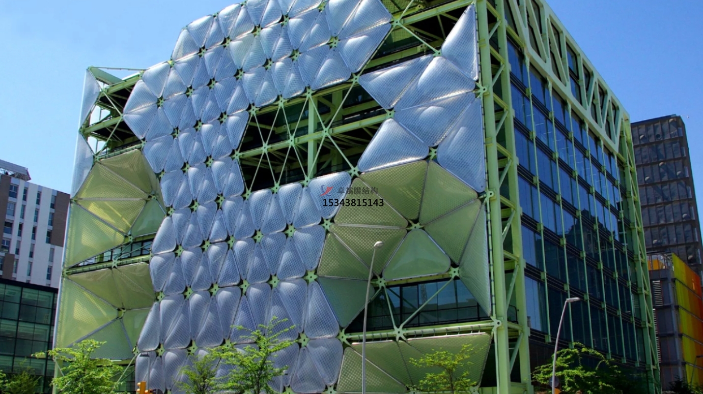 ETFE膜溫度基本與周圍環(huán)境溫度保持一致,不像玻璃會隨吸收輻射能力的增加而升溫,因此材料自身吸收或輻射能量的能力并不十分關鍵。除了在材料上進行的能量交換,由于氣體泄漏造成的能量損失可忽略不計,氣枕式膜結構連接構件可有效避免空氣的外泄,同時構件數(shù)量原本就較少,由此產(chǎn)生的節(jié)能效益相當于玻璃的3~4倍。