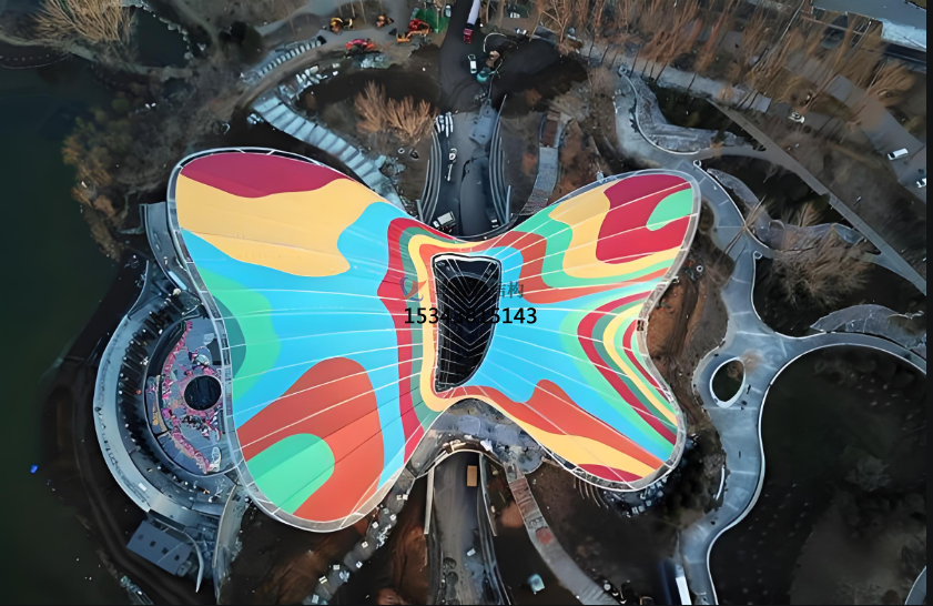 ETFE膜材除了常規(guī)的透明、藍(lán)色、白色、銀色鍍點(diǎn)外,其實(shí)還有五顏六色的彩色系列。今天就給大家介紹一個(gè)ETFE彩色膜應(yīng)用的經(jīng)典案例2019年北京世園會(huì)的主場(chǎng)館——媯汭劇場(chǎng),外觀為彩色蝴蝶造型。