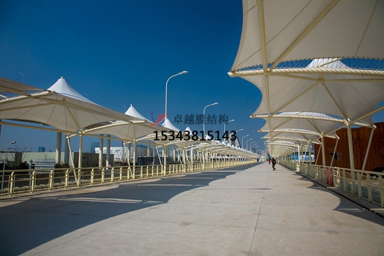 2、藝術性:除了一般雨蓬不可比擬的實用、耐用、遮風擋雨的功能外,膜結構雨蓬更是一座雕塑,一件藝術品,給人美的視覺享受。其柔美,其曲線,其剛柔并濟,其豐富造型,其潔白無瑕,讓人眼前一亮,回味悠長。