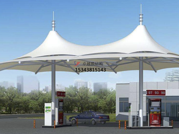 尖頂加油站張拉膜結(jié)構(gòu)效果圖展,常見(jiàn)的加油站張拉膜結(jié)構(gòu)是尖頂?shù)木佣啵咨玴vc材質(zhì)的膜也是居多,看上去干凈整潔,而且是阻燃材料,防火,防潮,使用周期久,易于護(hù)理和維護(hù),也是成為眾多加油站的不二之選。