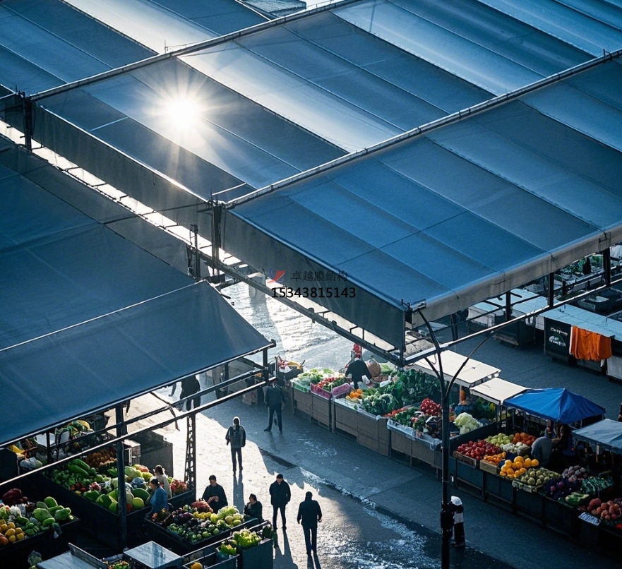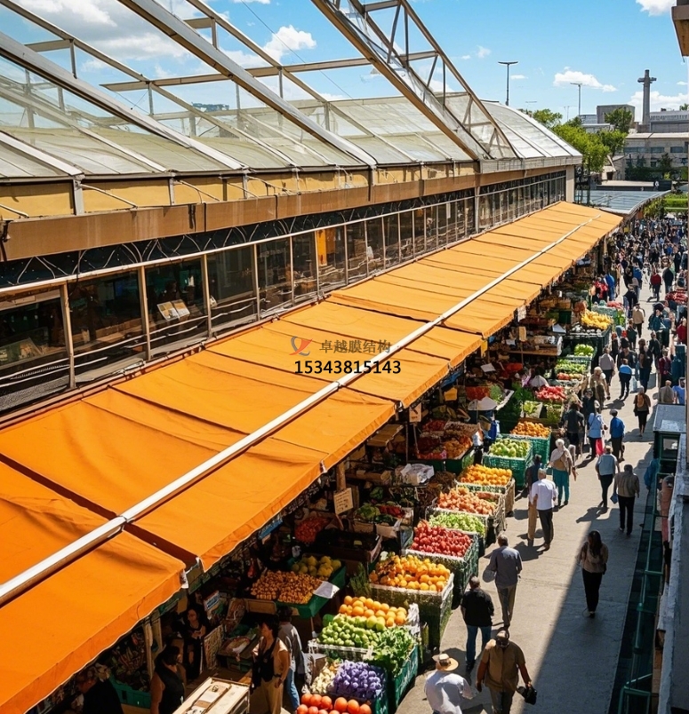 城市中心傳統(tǒng)農(nóng)貿(mào)市場(chǎng)改造:在城市核心區(qū)域,土地資源緊張,傳統(tǒng)農(nóng)貿(mào)市場(chǎng)設(shè)施陳舊、空間局促。膜結(jié)構(gòu)改造方案通過拆除原有老舊頂棚,搭建輕巧、美觀的膜結(jié)構(gòu)頂棚,能在不增加過多占地面積的情況下,優(yōu)化市場(chǎng)空間,提升采光、通風(fēng)效果,改善購(gòu)物環(huán)境,同時(shí)保留傳統(tǒng)市場(chǎng)的煙火氣,讓城市記憶與現(xiàn)代功能完美融合,如北京的部分老城區(qū)農(nóng)貿(mào)市場(chǎng)改造項(xiàng)目,就借助膜結(jié)構(gòu)實(shí)現(xiàn)了華麗轉(zhuǎn)身,重新煥發(fā)生機(jī)。