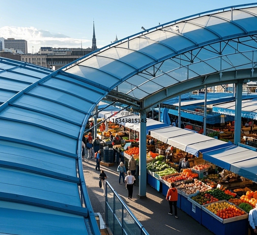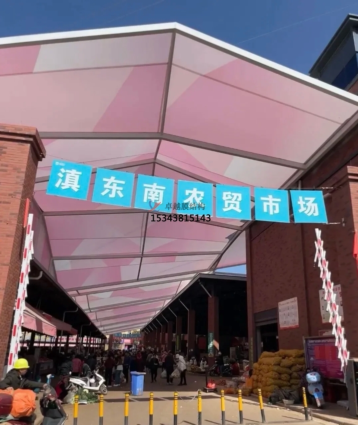美觀與個(gè)性化彰顯:膜結(jié)構(gòu)設(shè)計(jì)極具創(chuàng)意,能依據(jù)農(nóng)貿(mào)市場(chǎng)所在區(qū)域的文化特色、建筑風(fēng)格,定制獨(dú)特造型與色彩。或如靈動(dòng)的波浪,或似展翅的飛鳥,為傳統(tǒng)農(nóng)貿(mào)市場(chǎng)注入現(xiàn)代時(shí)尚元素,提升市場(chǎng)整體形象與辨識(shí)度。鮮明的色彩搭配,不僅能吸引消費(fèi)者目光,還能為市場(chǎng)營(yíng)造活潑、熱鬧的氛圍,讓農(nóng)貿(mào)市場(chǎng)成為城市中一道獨(dú)特的人文景觀,成為居民休閑購(gòu)物的好去處,帶動(dòng)周邊商業(yè)活力。