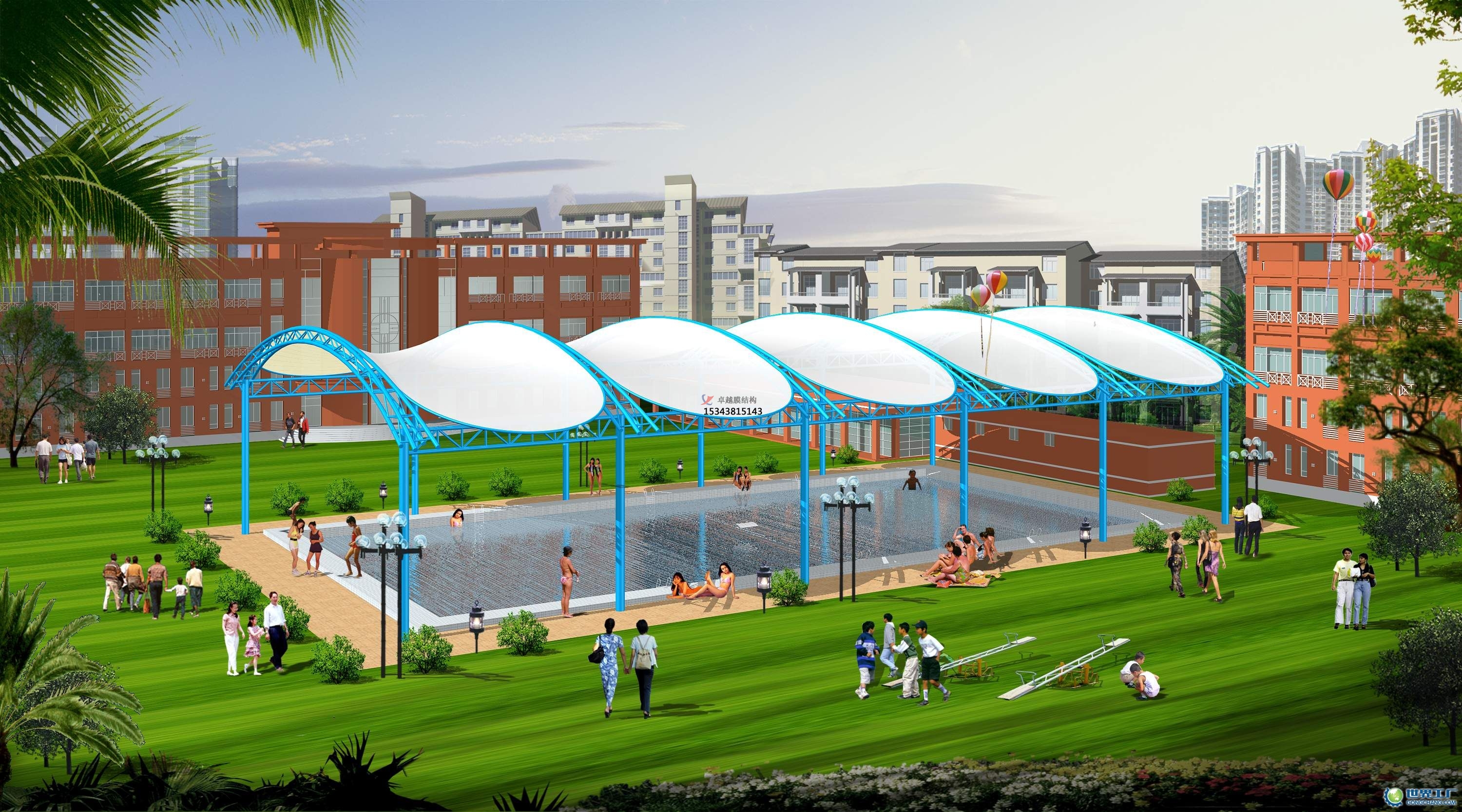 2.幾種膜結(jié)構(gòu) 與上述結(jié)構(gòu)膜結(jié)合的結(jié)構(gòu)大約有下述幾類: 1)純鋼拱形結(jié)構(gòu) 采用傳統(tǒng)的梁柱系統(tǒng),屋頂為圓拱式,柱梁間距一般為8m左右。 2)混凝土結(jié)構(gòu)主體加鋼拱 以上兩種更簡單的膜結(jié)構(gòu),依平面的形狀,如方形、菱形等,可有許多變化,拱的間距依使用的膜材強(qiáng)度、設(shè)計荷載、風(fēng)力等確定。 3)混凝土主體結(jié)構(gòu)加鋼索 脊素為上彎,位于膜布下面,谷索為下彎,位于膜上面。兩種鋼索的彎向相反張拉后造成相反方向的垂直力,使膜市受到垂直方向的張力,膜布中水平方向的張力直接張拉形成。 4)混凝土主體結(jié)構(gòu)加鋼柱 5)張拉式帳篷膜結(jié)構(gòu) 6)大型(跨度在200m以上)氣撐式膜結(jié)構(gòu) 用扁鋼作的鋼索加上膜布,可以做成大跨度的巨型屋頂。