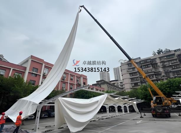 安裝過(guò)程:安裝過(guò)程分別是鋼結(jié)構(gòu)的安裝,膜材的安裝和附件安裝。鋼結(jié)構(gòu)的安裝會(huì)根據(jù)設(shè)計(jì)要求進(jìn)行鋼結(jié)構(gòu)基礎(chǔ)的施工,確?;A(chǔ)的尺寸、位置、標(biāo)高符合設(shè)計(jì)要求,做到表面光滑、無(wú)變形、無(wú)損傷。鋼結(jié)構(gòu)的安裝位置必須準(zhǔn)確,將鋼結(jié)構(gòu)構(gòu)件在地面進(jìn)行預(yù)組裝,檢查各構(gòu)件的連接是否準(zhǔn)確、牢固,使用專(zhuān)業(yè)的吊裝設(shè)備,如起重機(jī)等,按照預(yù)定的吊裝方案進(jìn)行操作,確保鋼結(jié)構(gòu)的安裝位置準(zhǔn)確。要隨時(shí)進(jìn)行測(cè)量和調(diào)整,保證鋼結(jié)構(gòu)的垂直度、水平度和跨度等符合設(shè)計(jì)要求。采用焊接、螺栓連接等方式將鋼結(jié)構(gòu)構(gòu)件連接固定,確保連接的強(qiáng)度和可靠性。焊接時(shí),要嚴(yán)格控制焊接質(zhì)量,避免出現(xiàn)焊接缺陷。膜材的安裝過(guò)程,膜面的尺寸和形狀必須符合設(shè)計(jì)要求,表面干凈、無(wú)損傷。膜材在安裝現(xiàn)場(chǎng)按照預(yù)定的方向和位置展開(kāi),同時(shí)應(yīng)注意避免膜材與地面或其他物體摩擦、劃傷。使用專(zhuān)用的夾具或繩索將膜材固定在鋼結(jié)構(gòu)上,初步調(diào)整膜材的位置,使其與鋼結(jié)構(gòu)的連接點(diǎn)對(duì)齊。進(jìn)行逐步且均衡的膜面張拉,張拉過(guò)程要均勻、緩慢地進(jìn)行,施加適當(dāng)?shù)念A(yù)張力,同時(shí)要根據(jù)膜材的實(shí)際情況,對(duì)張拉力進(jìn)行適當(dāng)?shù)恼{(diào)整,保證膜材表面平整、光滑,無(wú)褶皺、松弛等現(xiàn)象,使其達(dá)到設(shè)計(jì)要求。在膜材張拉到位后,使用專(zhuān)用的固定件將膜材牢固地固定在鋼結(jié)構(gòu)上。固定件的間距和安裝方式要符合設(shè)計(jì)要求,確保膜材在使用過(guò)程中不會(huì)出現(xiàn)松動(dòng)或位移。附件安裝,附件的安裝包括排水系統(tǒng)安裝,遮陽(yáng)設(shè)施安裝和安全設(shè)施安裝。安裝膜結(jié)構(gòu)的排水槽、落水口等排水設(shè)施,確保雨水能夠順利排出,避免在膜面形成積水。排水系統(tǒng)的安裝要保證密封性和排水順暢性。如果膜結(jié)構(gòu)設(shè)計(jì)有遮陽(yáng)要求,安裝相應(yīng)的遮陽(yáng)簾、遮陽(yáng)網(wǎng)等遮陽(yáng)設(shè)施。遮陽(yáng)設(shè)施的安裝要牢固可靠,能夠滿足遮陽(yáng)和使用功能的要求。安裝必要的安全設(shè)施,如欄桿、安全網(wǎng)等,確保人員在膜結(jié)構(gòu)區(qū)域內(nèi)的安全。