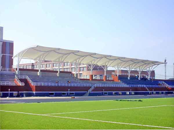 張拉膜看臺主要用于各類地方體育場主席臺雨棚,各類學校體育場看臺雨棚遮蓋,我公司是國內較早從事大懸挑張拉膜結構看臺設計施工的專業(yè)廠家,下面介紹一下我們在南昌市周邊縣市完工的一些張拉膜看臺設計施工案例,我公司先后在南昌周邊承接了江西水利職業(yè)學院張拉膜看臺雨棚、江西衛(wèi)生職業(yè)學院張拉膜看臺罩棚、江西外語外貿職業(yè)學院張拉膜看臺遮陽棚等設計施工項目,簡介如下: