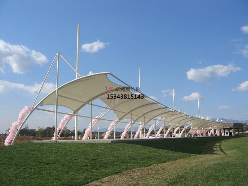 以膜材、鋼索及支柱構(gòu)成,利用鋼索與支柱在膜材中導(dǎo)入張力以達(dá)安定的形式。除了可實踐具創(chuàng)意,創(chuàng)新且美觀的造型外,也是更能展現(xiàn)膜結(jié)構(gòu)精神的構(gòu)造形式. 近年來,大型跨距空間也多采用以鋼索與壓縮材構(gòu)成鋼索網(wǎng)來支撐上部膜材的形式。膜結(jié)構(gòu)停車篷,因施工精度要求高,結(jié)構(gòu)性能強,且具豐富的表現(xiàn)力,所以造價略高于骨架式膜結(jié)構(gòu)。