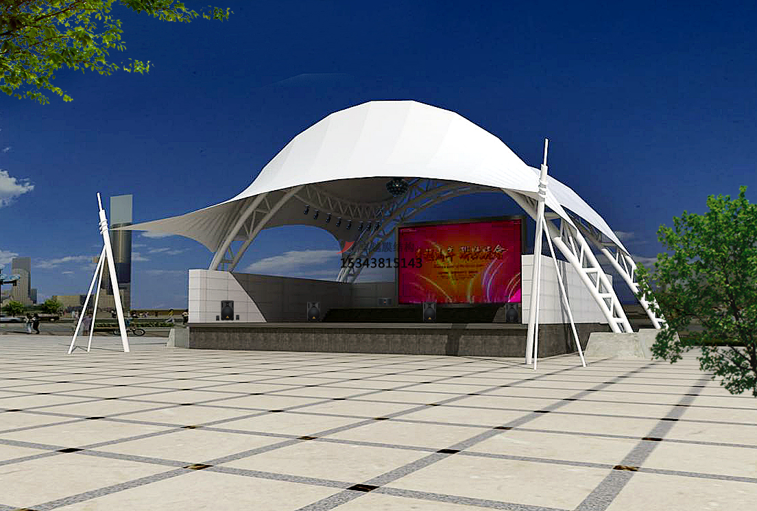 設(shè)計靈活:膜結(jié)構(gòu)可以根據(jù)設(shè)計師的創(chuàng)意和需求,塑造出各種獨特、富有藝術(shù)感的形狀,使舞臺更具視覺沖擊力。