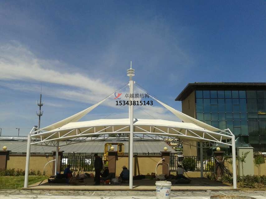 6、景觀設(shè)施:膜結(jié)構(gòu)以其特殊的建筑表現(xiàn)手法,主要體現(xiàn)在造型、漫射透光性、豐富多彩,可廣泛應(yīng)用于入口、標(biāo)志性小品 、步行街、停車場等,其他建筑特性無須較高要求。