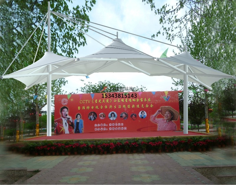 近年來,隨著建筑空間觀念的日益深化以及科學(xué)手段的不斷提高,膜結(jié)構(gòu)已是現(xiàn)代建筑環(huán)境學(xué)發(fā)展的主流。它可以構(gòu)成單曲面,多曲面等不同建筑結(jié)構(gòu)形式,滿足了建筑師們對建筑與美學(xué)高度統(tǒng)一的要求。 由于膜材的光透性,白天陽光可以透過膜材形成漫射光,使舞臺下如同自然,能很好地節(jié)約能源。夜間彩燈打射形成的絢爛景觀也讓市民體驗到不一樣的感覺。膜材具有防水 性和遮陽效果,而不受到日曬雨淋,因此膜結(jié)構(gòu)舞臺能創(chuàng)造出與自然環(huán)境相媲美的空間形式。