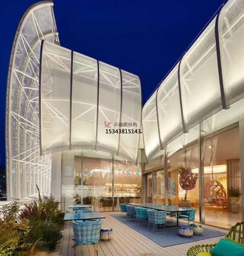 膜結(jié)構(gòu)使得建筑輕盈感十足,膜材料的良好透性使得建筑界面透光而不透視。由于該材料(ETFE)氣枕在陽光底下富有通透感光線可以通過漫射和折射進入界面,讓膜結(jié)構(gòu)建筑呈現(xiàn)出朦朧夢幻之美。