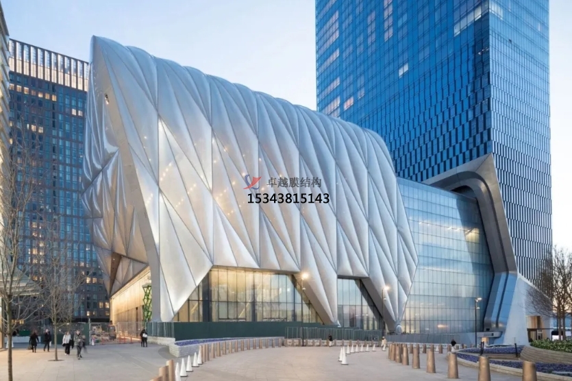 The Shed藝術(shù)中心樓高37米,有一個可伸縮的建筑表皮,伸縮式外殼由暴露的鋼斜架構(gòu)成,并包裹在半透明墊層中。其墊層由耐用輕質(zhì)且隔熱性能極佳的四氟乙烯(ETFE)聚合物構(gòu)成。
