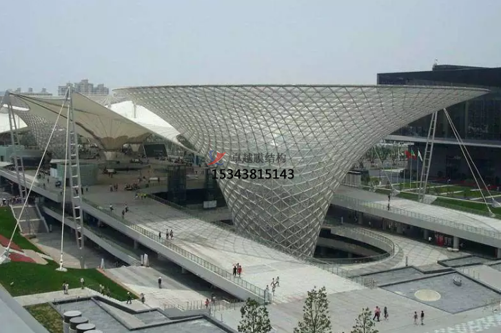 建筑入口使城市公共空間與建筑空間相鄰的界面,成為城市空間的組成部分。它是人們視覺更先接觸的部分,因此,除了功能以外,還應有很強的標識性,并能體現(xiàn)建筑的個性,是建筑環(huán)境和城市景觀的重要組成部分。由于膜結(jié)構自然的曲線美是其他結(jié)構類型無法比擬的,故成為近來建筑入口及屋頂經(jīng)常采用的形式。