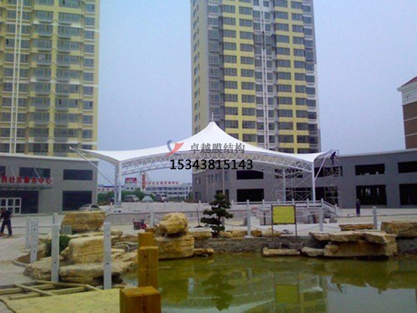4、準(zhǔn)備工作就緒以后,起重機(jī)械,起重和對角線做臨時(shí)固定的點(diǎn)。逐步平衡張力調(diào)整,對膜表面張力。應(yīng)用過程中張力非常重要,如果不足或過度自負(fù),很可能導(dǎo)致膜結(jié)構(gòu)工程的崩潰或摧毀,因此希望膜結(jié)構(gòu)在這段準(zhǔn)備更充分。