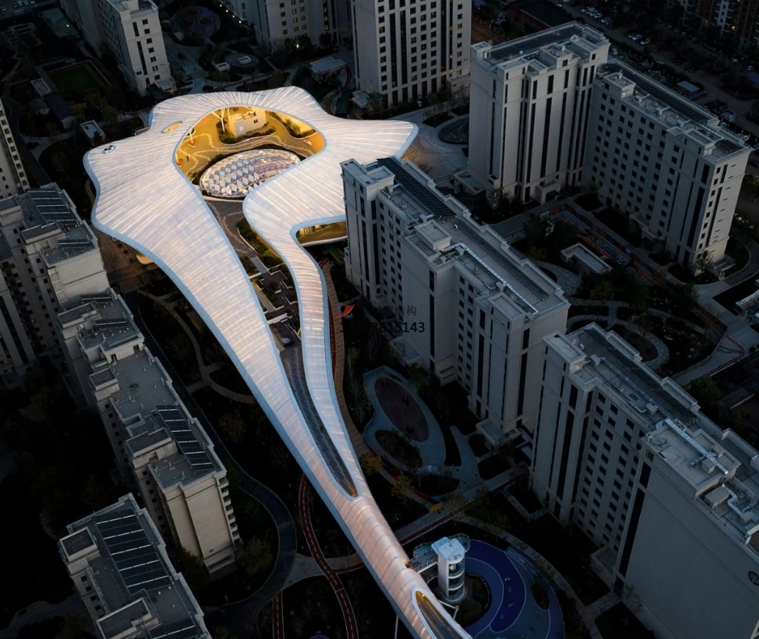 相對(duì)于四周規(guī)則的建筑形態(tài),活力中心呈現(xiàn)更加自由和充滿活力的有機(jī)形態(tài):如一顆水珠滴落,在場(chǎng)地中激起漣漪,自中心散開、升騰,形成一片白色、柔軟的云朵,最終轉(zhuǎn)化為自由的大屋頂。