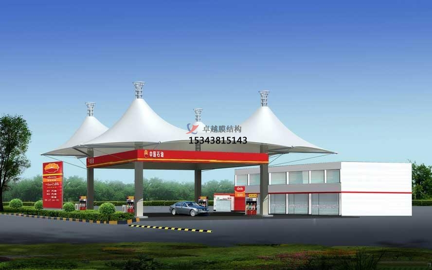 膜結(jié)構(gòu)加油站罩棚的篷布材質(zhì)是膜結(jié)構(gòu),而膜材的更大特點(diǎn)是強(qiáng)度高、耐久性好、防火難燃、自潔性好,不受紫外線影響,使用壽命長(zhǎng),一般15-30年。具有高透光率,透光率為13%,對(duì)熱能反射率73%,熱吸收量很少。正是因?yàn)檫@種劃時(shí)代的膜材料的發(fā)明,使膜結(jié)構(gòu)加油站罩棚成為現(xiàn)代化的永久建筑。
