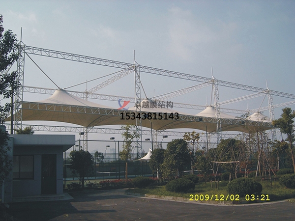 其次是膜結(jié)構(gòu)體育館頂部遮陽防雨頂棚板選用白色(其他色彩可選擇)膜布,與車棚骨架用鍍鋅扁鐵壓好,燕尾絲固定卡死,一方狂風(fēng)對車棚的威脅。