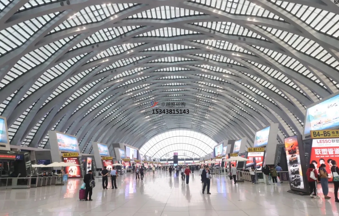 在機(jī)場(chǎng),膜結(jié)構(gòu)被廣泛應(yīng)用于航站樓的各個(gè)部位。例如,機(jī)場(chǎng)的到達(dá)和出發(fā)遮陽(yáng)蓬、候機(jī)樓內(nèi)的膜結(jié)構(gòu)吊頂?shù)?,都采用了膜結(jié)構(gòu)技術(shù)。這些膜結(jié)構(gòu)不僅為旅客提供了舒適的候機(jī)環(huán)境,還通過(guò)其獨(dú)特的造型和透光性,將陽(yáng)光過(guò)濾成柔和的散射光源,營(yíng)造出溫馨而明亮的氛圍。