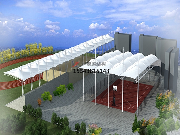 膜結構車棚膜結構所用的膜材料為具有、阻燃、耐久、自潔等特性的復合材料,一般由基布和涂層二部分組成?;贾饕捎镁壑w維或玻璃纖維絲編織而成,有平織和絞等多種編織方法,不同的膜結構車蓬編織方法影響著膜材料的經(jīng)緯向力學性能指標,膜的抗拉強度和抗撕裂強度等;涂層材料主要有聚四氟乙烯和聚氯乙烯,在一定程度上提高了膜材料各項強度指標,為提高膜材料的耐久、自潔等特性,表面往往有一層氟涂層或硅涂層,膜材料的耐火、耐久及防水、自潔等性能,決定著膜材料的物理特性。