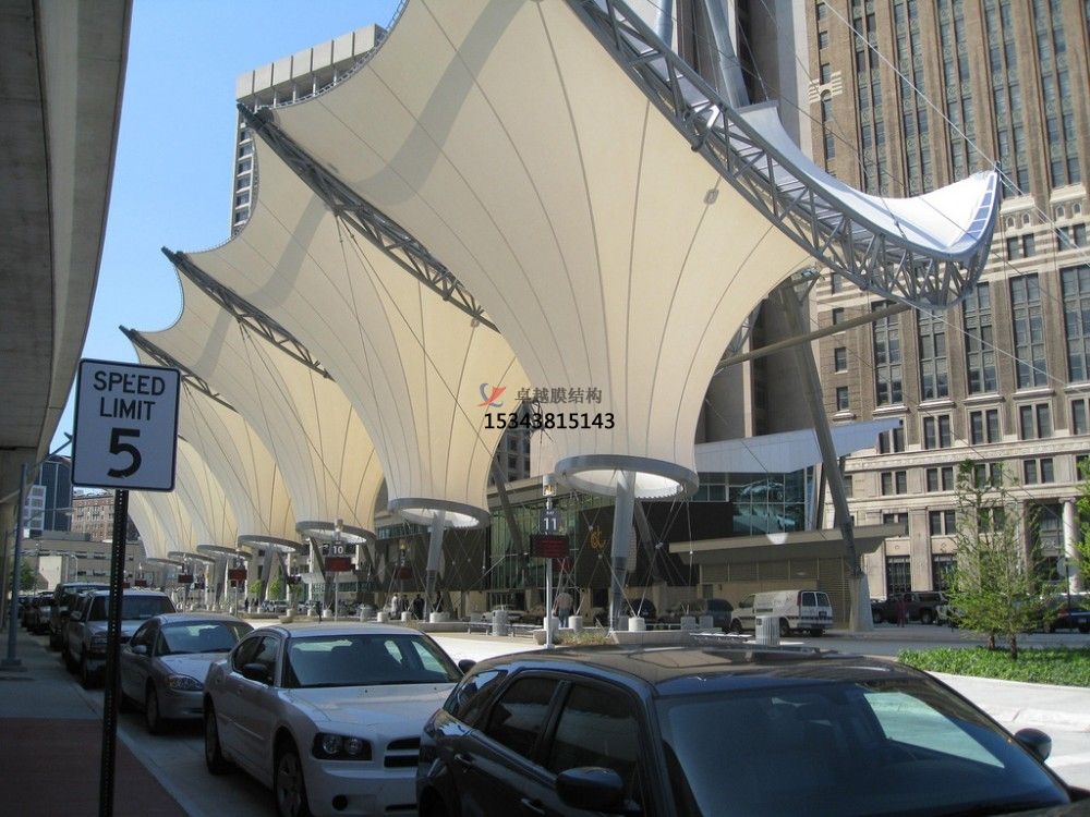 膜結(jié)構(gòu)車棚主要有很多進口的原料,它的支架也使用了高超的制作工藝。很好的先是它的耐用性,它的材料是那種高強度的張拉膜,是一種可以使用40多年的材料,如果遇到狂風(fēng)暴雨也不會有很大的破壞;還有它的藝術(shù)性,它的造型師非常美觀的,尤其是它的曲線美;經(jīng)濟性,把車放在里面,可以減緩損壞的速度,增加車輛的使用壽命;透光性也是非常好的,也可以阻擋紫外線的輻射;重量也是非常輕的,在發(fā)生坍塌或者危險的時候,可以保護棚下面的人或者物品的安全。