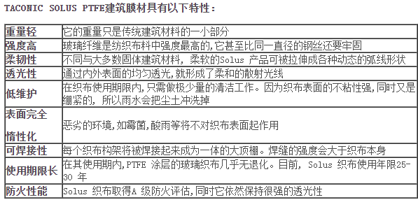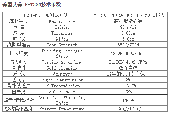 艾美PTFE膜材,本產(chǎn)品具有很好的柔韌性及高抗拉、抗撕裂強(qiáng)度,超細(xì)玻璃纖維絲織物基布(3-5微米絲徑)涂層PTFE (聚四氟乙烯),在 -50℃到+200℃溫度范圍內(nèi)安全使用,具有良好的耐熱、耐濕等特性,同時(shí)提高了產(chǎn)品的抗彎曲、抗折、抗磨損性,使用壽命可達(dá)25年甚至更長(zhǎng)的時(shí)間。